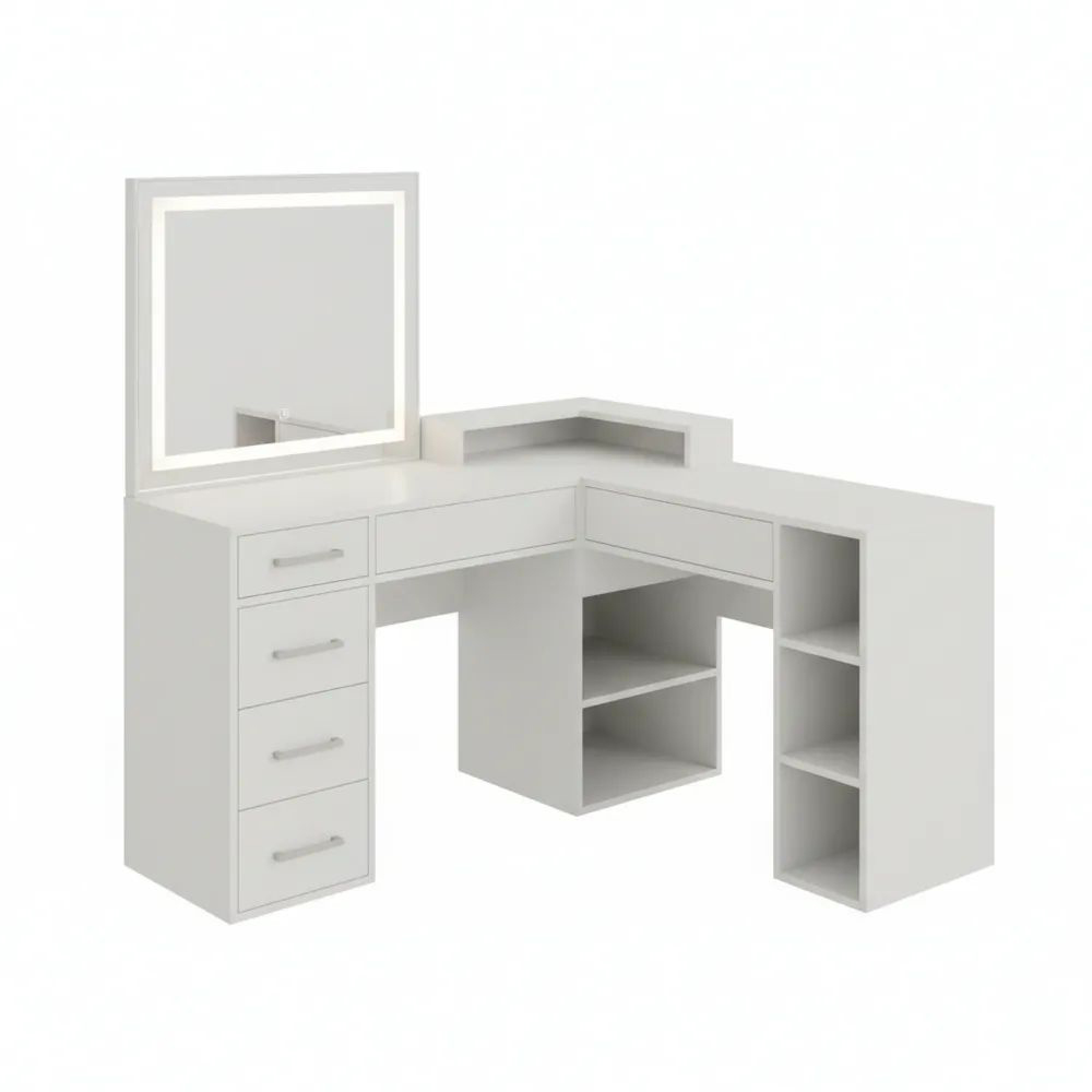 Eckschminktisch mit LED-Beleuchtung und Stauraum in Weiß