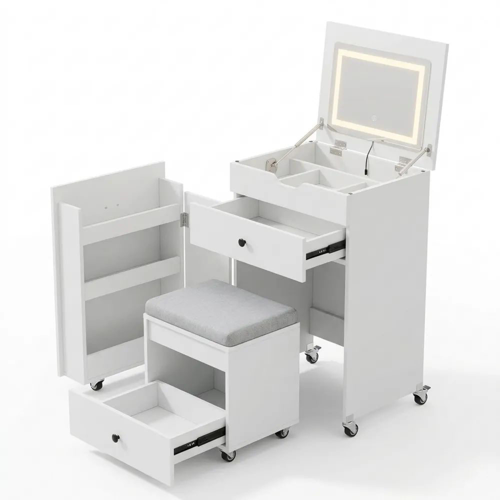 Kompakter Schminktisch mit Spiegel und Beleuchtung, Set mit gepolstertem Hocker und Schubladen, ideal für kleine Räume, Weiß