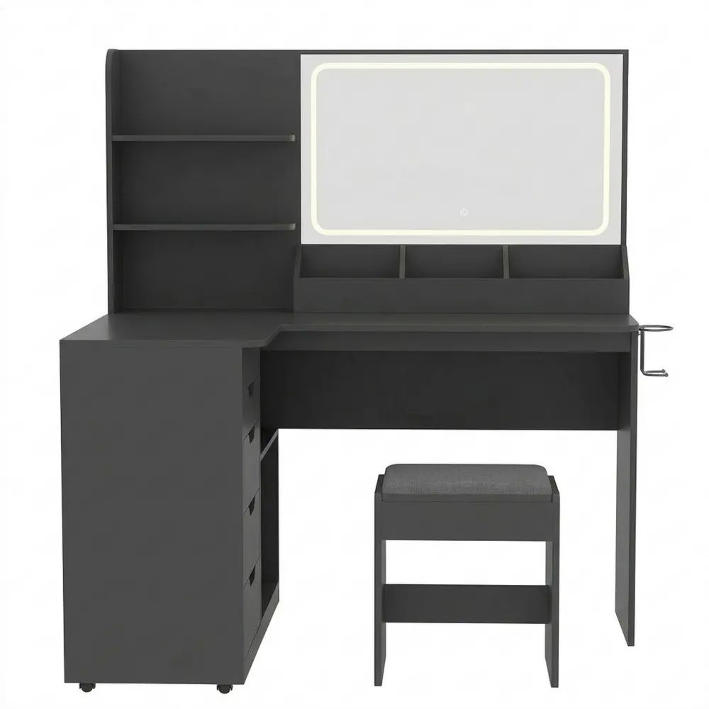 Eckiger Schminktisch mit LED-Beleuchtung und Spiegel, 5 Schubladen, Schwarz